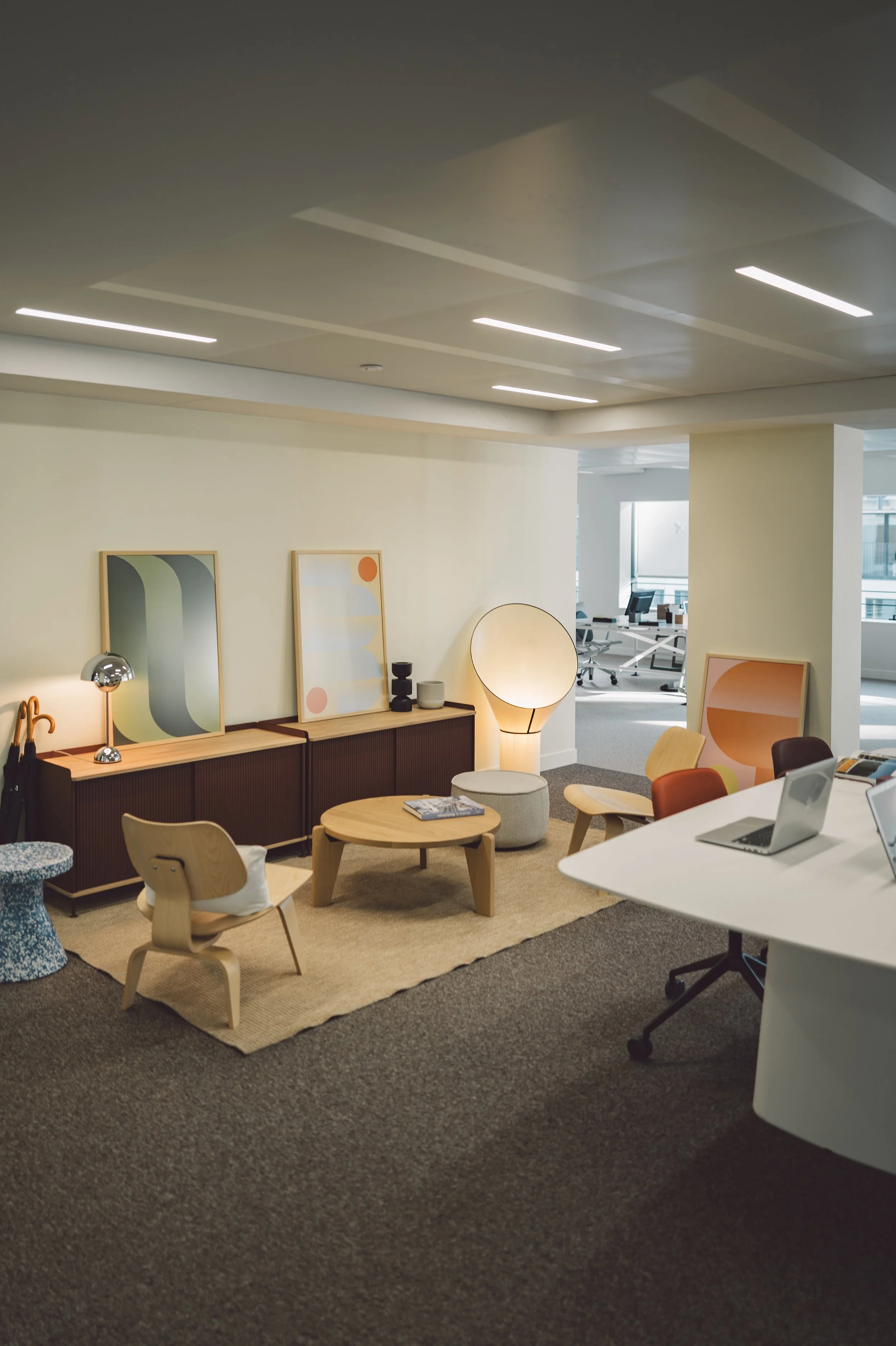 My role was to style the marketing suite in a way that complemented the architects’ vision. For this, I have created a colourful graphic language inspired by the geometric Lightwell logo. It allowed me to develop window graphics, frames and murals incorporating URW’s marketing messages throughout the entire marketing suite.
