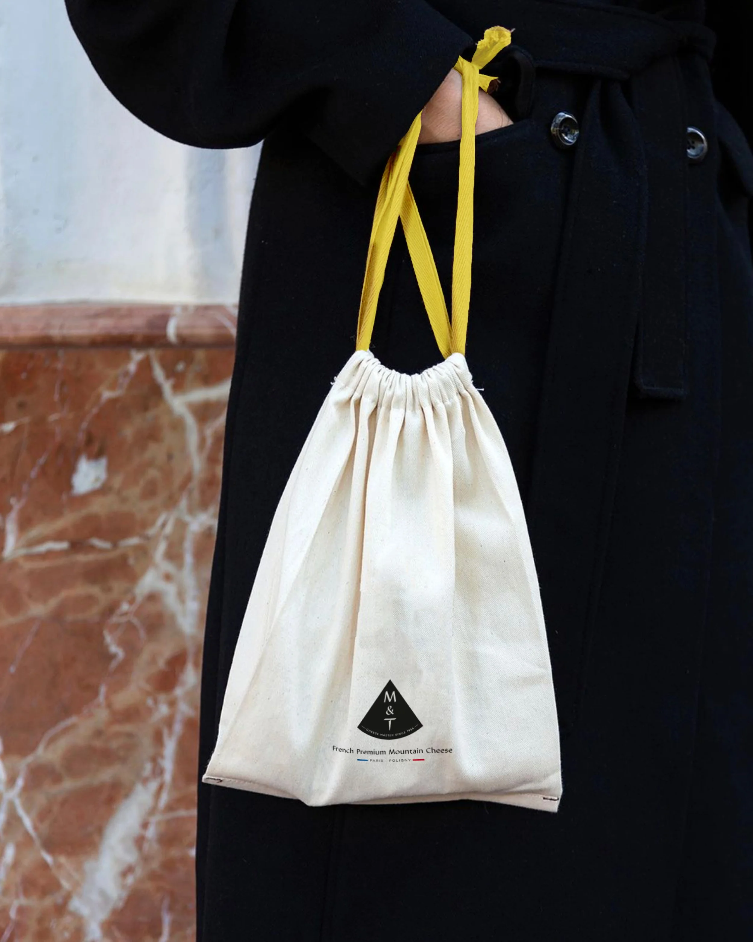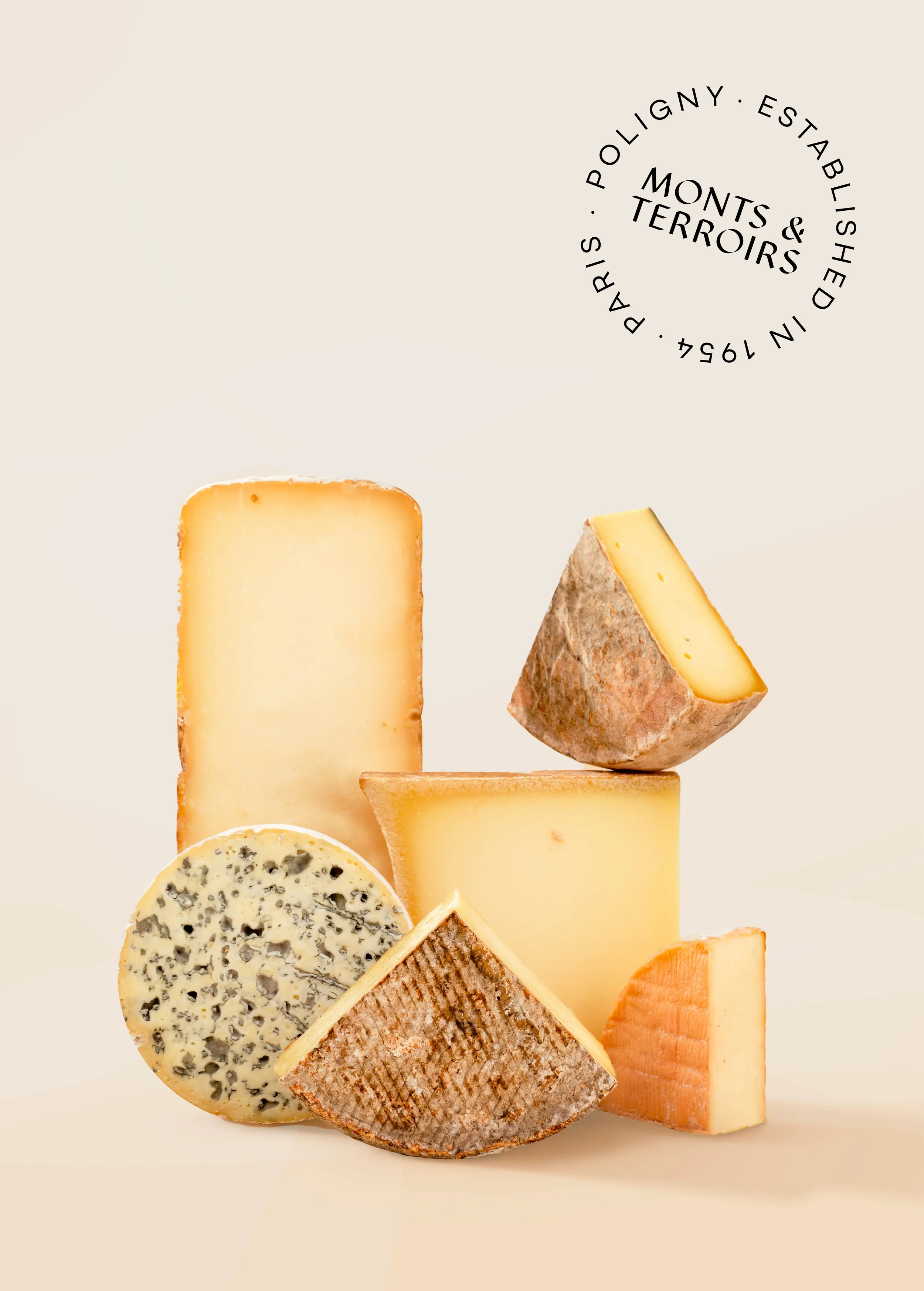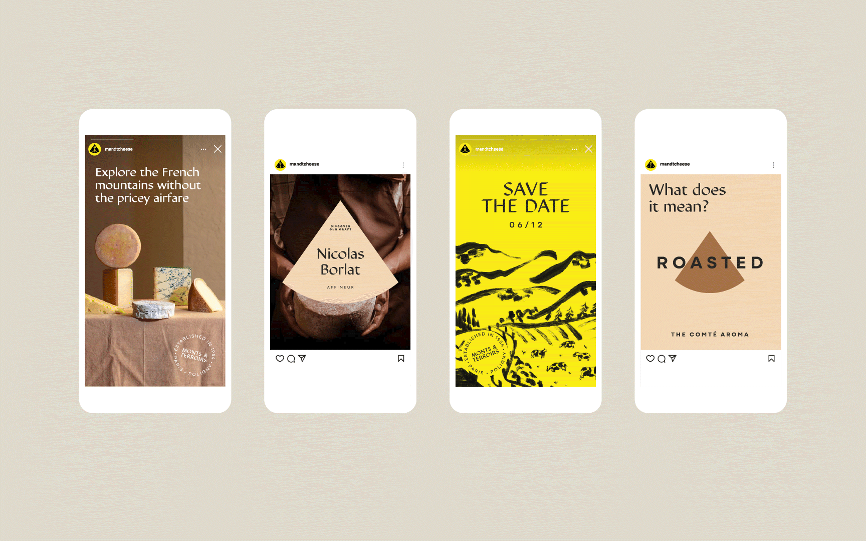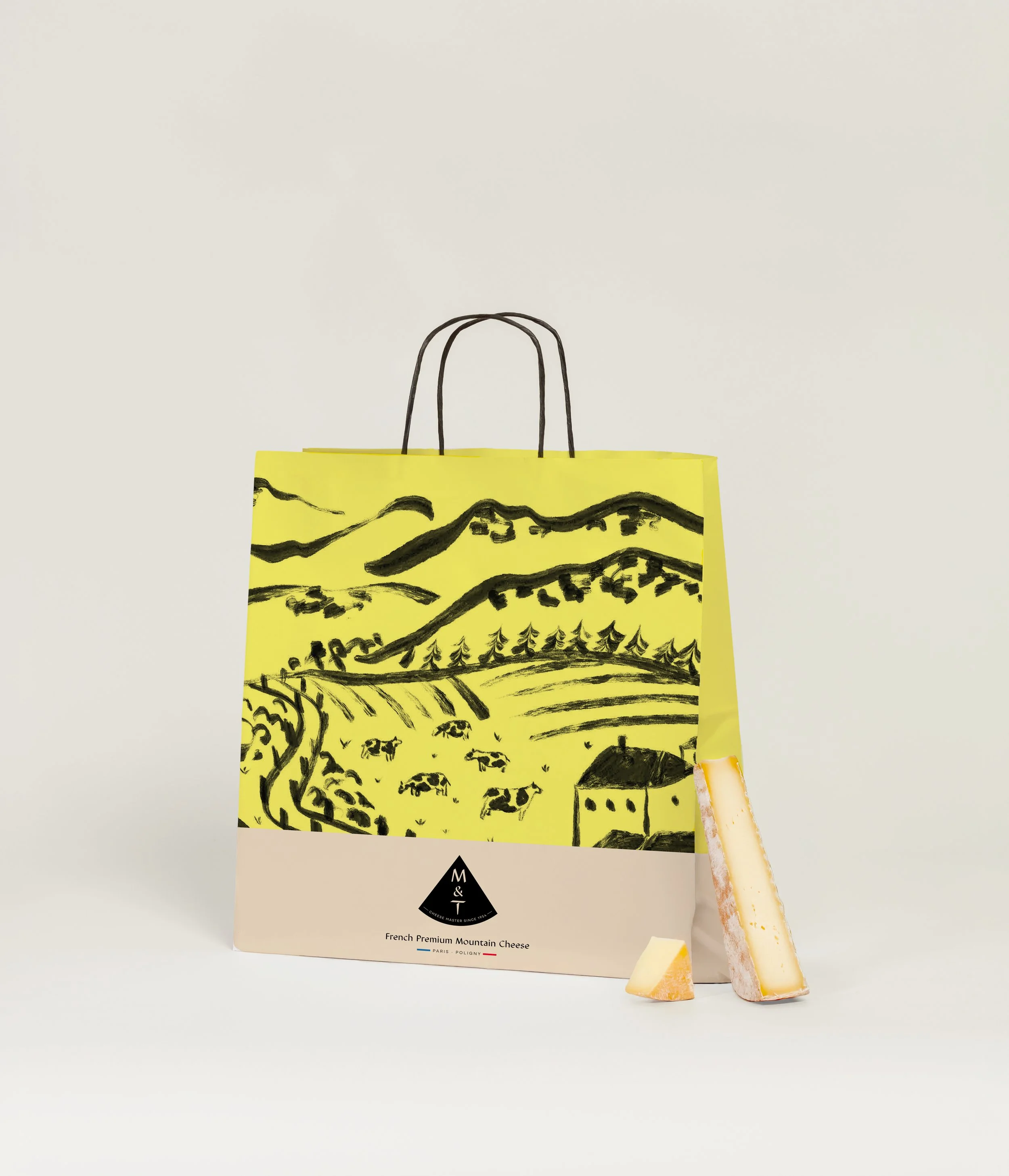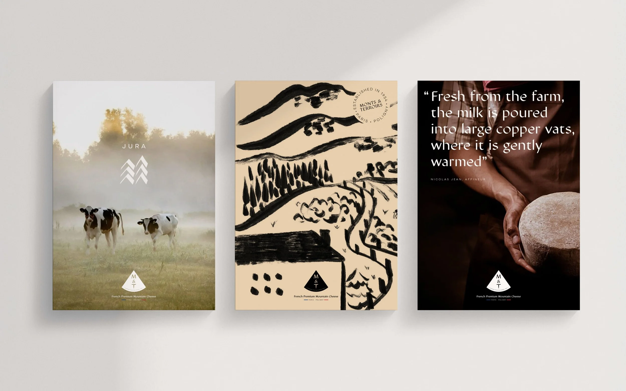 The M&T monogram features a chiselled typeface, highlighting the craftsmanship behind cheese-making, with the T subtly redrawn to resemble a cheese probe. It is embedded within the brand’s signature shape, evoking both a mountain and a quarter wheel of cheese.