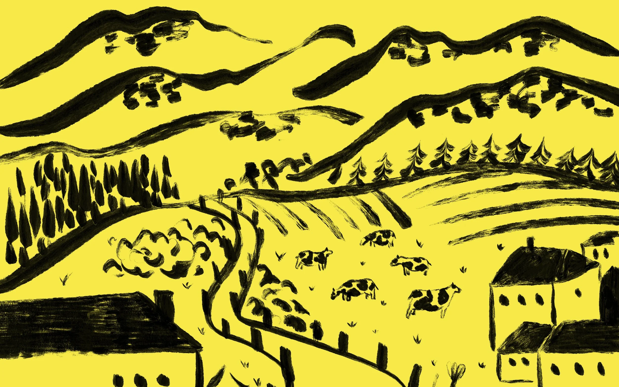 We collaborated with an illustrator to reinterpret Poligny, the brand’s birthplace, incorporating its mountains, cows, and trees. The illustration serves as the centrepiece of the brand, used prominently as an all-over pattern. To ensure strong differentiation in the cheese market, we chose a bright yellow as the brand’s signature colour.